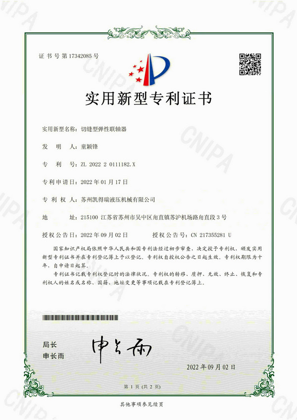 專利證書-切縫型彈性聯(lián)軸器