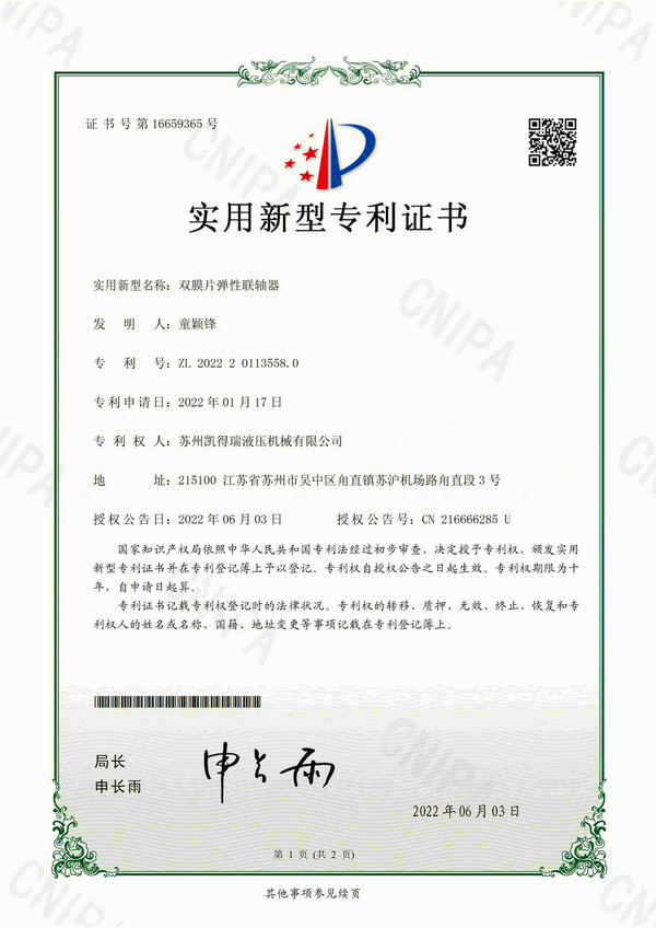 專利證書-雙膜片彈性聯(lián)軸器